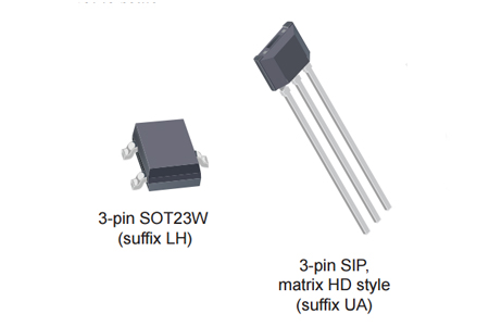 BiCMOS 工艺小巧精致的几何尺寸让这些器件均能以超小型封装形式提供。现有的封装类型为大多数应用提供磁性最优化的解决方案。封装 LH 是 SOT23W 微型低厚度表面安装型封装,而封装 UA 是供过孔安装使用的三引脚超小型 SIP。所有封装均不含铅,引脚框采用 100% 雾锡电镀。